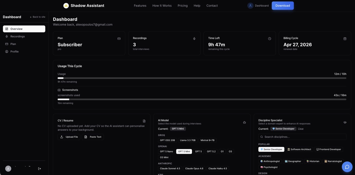 From technical interviews to client calls, Shadow Assistant has you covered.
